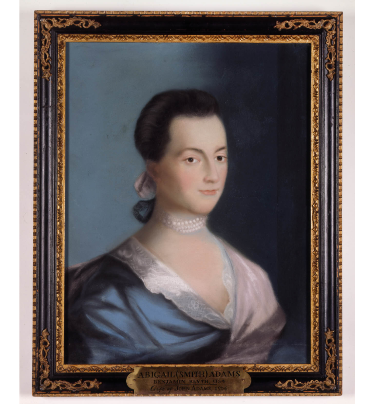 “By the time of her wedding, [Abigail was] little more than five feet tall, with dark brown hair, brown eyes, and a fine, pale complexion. For a rather stiff pastel portrait, one of a pair that she and John sat for in Salem a few years after their marriage, she posed with just a hint of a smile, three strands of pearls at the neck, her hair pulled back with a blue ribbon. But where the flat, oval face in her husband’s portrait conveyed nothing of his bristling intelligence and appetite for life, in hers there was a strong, unmistakable look of good sense and character. He could have been almost any well-fed, untested young man with dark, arched brows and a grey wig, while she was distinctively attractive, readily identifiable, her intent dark eyes clearly focused on the world.”